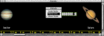 Individual planets can be turned off. This feature is useful because it allows the removal of background clutter on certain models that you create. As with all RISC OS menus, clicking on a choice with Select closes the menu. If you want to turn some planets on, or others off, you should use Adjust. In this way, the menu remains open.